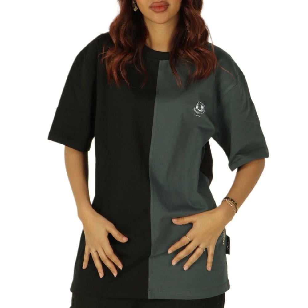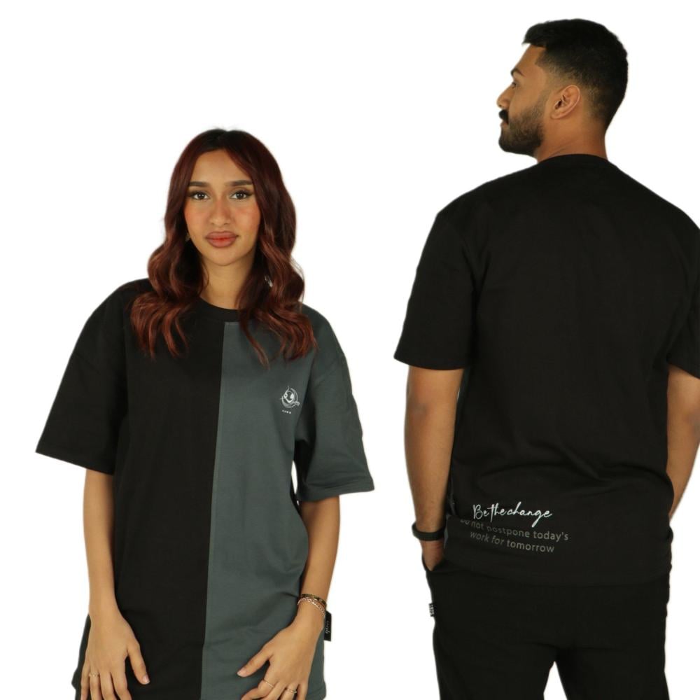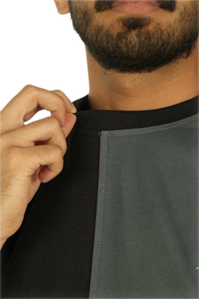تي شيرت فضفاض يجمع بين اللونين الأسود والرمادي.